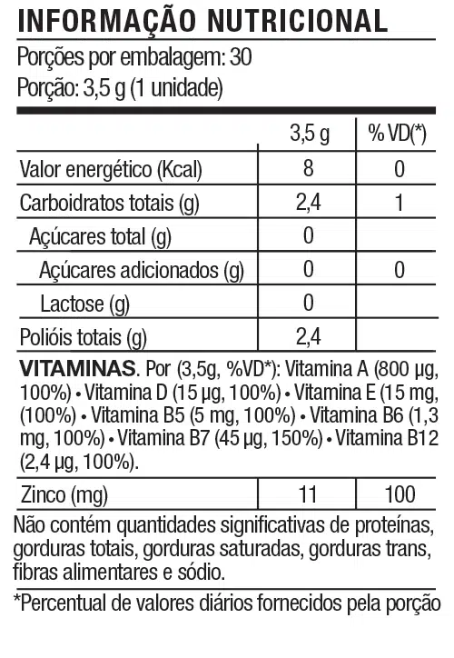 Bisglicinato de zinco, acetato de DL-alfa-tocoferol, acetato de retinol, D-pantotenato de cálcio, triglicerídeos de cadeia média, cloridrato de piridoxina, D-biotina, colecalciferol, cianocobalamina, edulcorantes xarope de maltitol, xilitol e glicosídeos de esteviol de Stevia rebaudiana Bertoni, gelificantes gelatina e pectina, acidulantes ácido cítrico e ácido lático, aromatizante natural de frutas vermelhas, corante natural carmins, conservante sorbato de potássio, glaceante cera de abelha e cera de carnaúba.