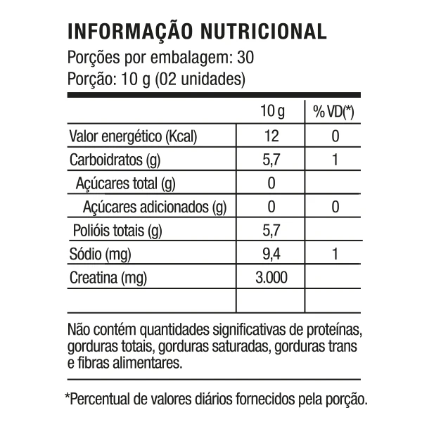 Creatina monohidratada, glicina, óleo de palma (Elaeis guineenses), edulcorantes xarope de maltitol, sorbitol e glicosídeos de esteviol, gelificantes gelatina e pectina, acidulante ácido cítrico, aromatizante natural de amora, maçã verde e manga, corante natural carmins e clorofila, corante sintético idêntico ao natural b-caroteno, conservante sorbato de potássio, glaceantes cera de abelha e cera de carnaúba.
