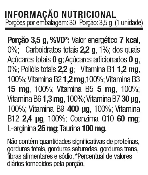 Taurina, Coenzima Q10, L-arginina, niacinamida, D-pantotenato de cálcio, cloridrato de piridoxina, cloridrato de tiamina, riboflavina, óleo de palma, ácido fólico, D-biotina, cianocobalamina, edulcorantes xarope de maltitol, sorbitol e glicosídeos de esteviol, gelificantes gelatina e pectina, acidulantes ácido cítrico, aroma natural de chocolate, corante natural de caramelo tipo I, conservante sorbato de potássio, glaceantes cera de abelha e cera de carnaúba.