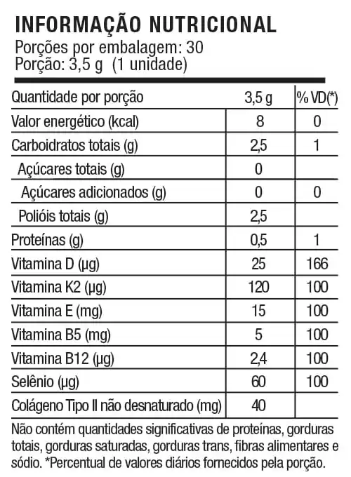 Colágeno de frango com colágeno tipo II não desnaturado, inulina obtida da raiz de chicória (Cichorium intybus), acetato de DL-alfa-tocoferol (vitamina E), D-pantotenato de cálcio (vitamina B5), triglicerídeos de cadeia média, Menaquinona-7 (vitamina K), selenometionina, colecalciferol (vitamina D3), cianocobalamina (vitamina B12), edulcorantes xarope de maltitol, sorbitol e glicosídeos de esteviol (stévia), gelificantes gelatina e pectina, acidulante ácido cítrico, aromatizante natural de café, corante natural caramelo tipo I, conservante sorbato de potássio, glaceante cera de abelha e cera de carnaúba.
