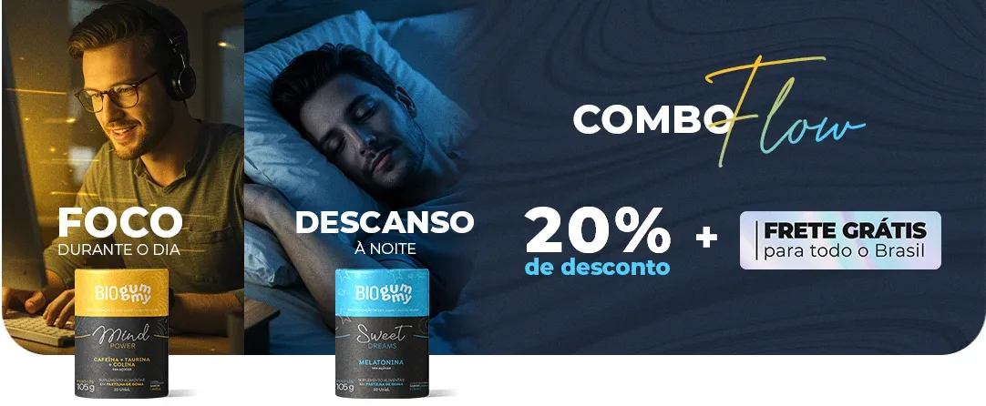 O Combo Flow une dois produtos essenciais para quem busca mais equilíbrio e produtividade no dia a dia. De um lado, a Melatonina Biogummy proporciona um sono profundo e reparador. Do outro, o Mind Power estimula sua concentração, memória e energia mental. Juntos, eles garantem noites de qualidade e dias mais produtivos.