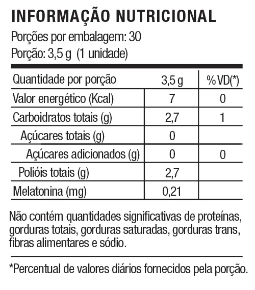 Melatonina, óleo de palma (Elaeis guineenses), edulcorantes xarope de maltitol, isomalte (isomaltulose hidrogenada) e maltitol, gelificante pectinas, acidulante ácido cítrico, aromatizante natural de laranja, corante natural curcumina, glaceante cera de carnaúba.