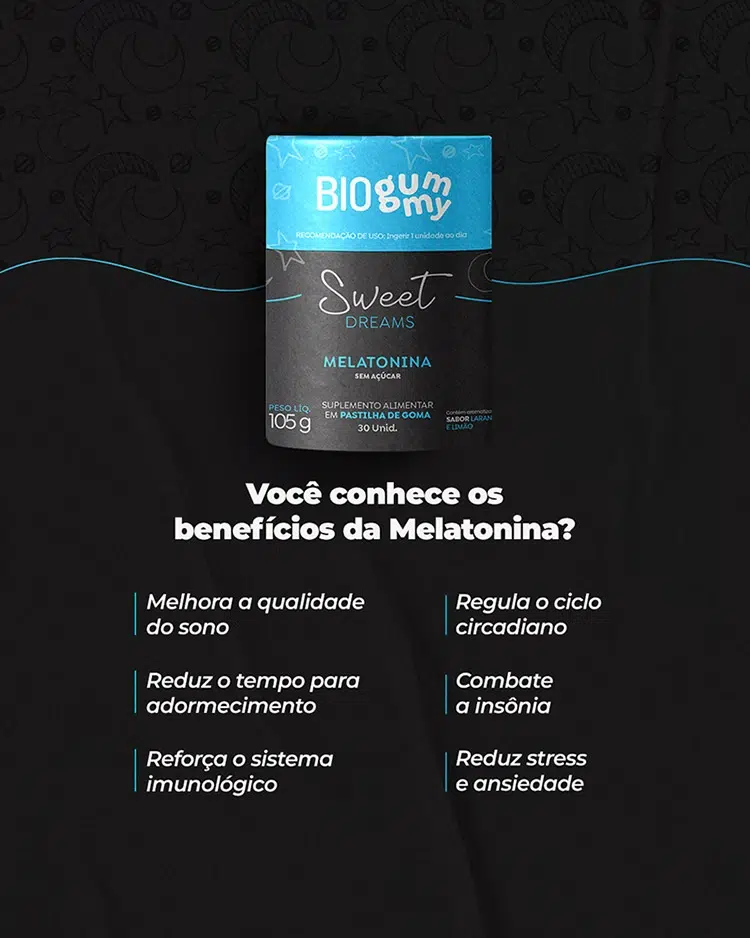 Com a Melatonina Sweet Dreams da Biogummy, você pode dizer adeus às noites de insônia e desfrutar de um descanso completo e reparador.