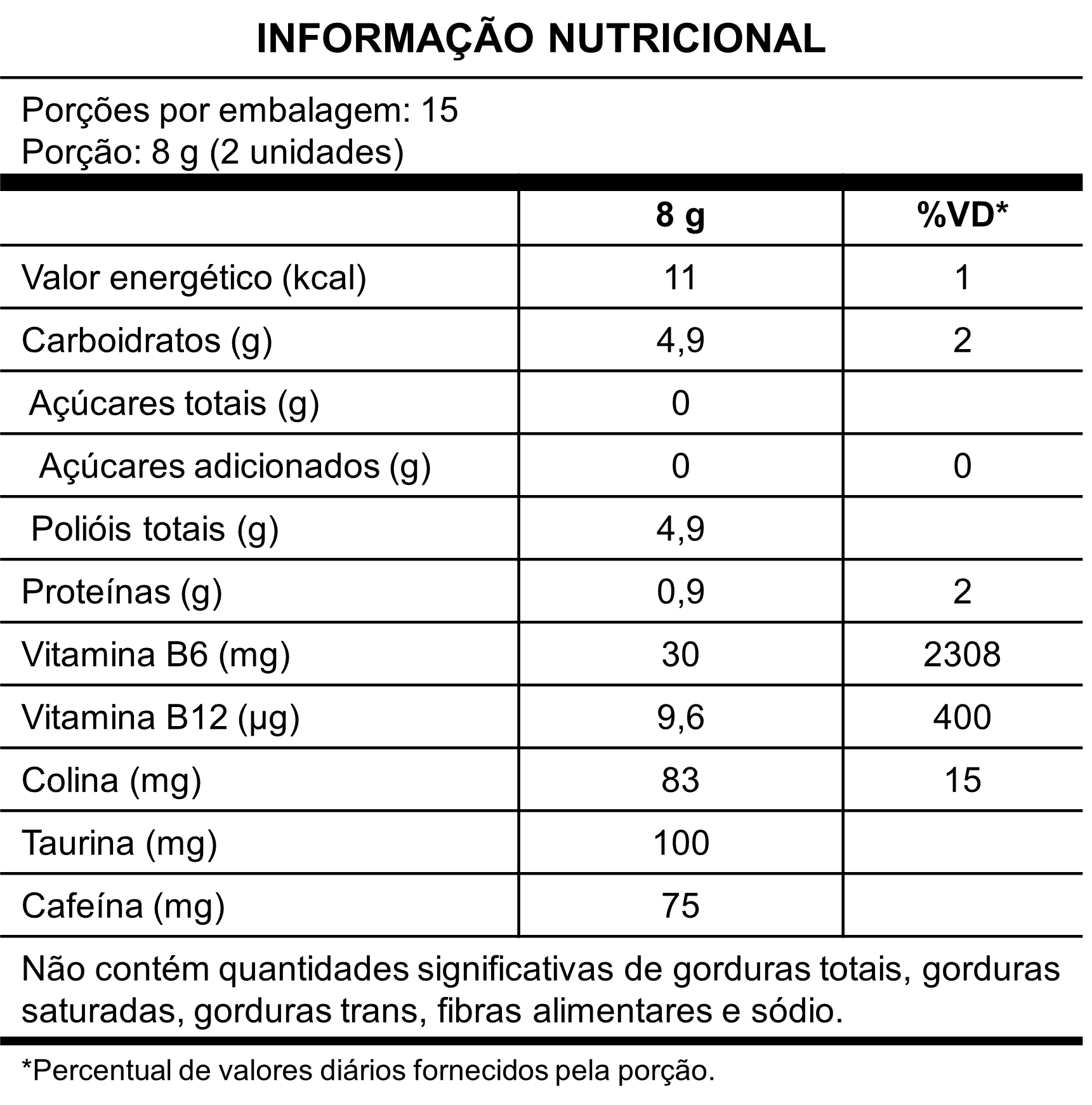 Bitartarato de colina, L-taurina, cloridrato de piridoxina, cafeína, triglicerídeos de cadeia média, cianocobalamina, edulcorantes xarope de maltitol, sorbitol, eritritol, glicosídeos de esteviol e sucralose, gelificantes gelatina e pectina, acidulantes ácido cítrico e ácido lático, aroma natural de canela, corante natural carmim de cochonilha, conservante sorbato de potássio, glaceante cera de abelha e cera de carnaúba. NÃO CONTÉM GLÚTEN.