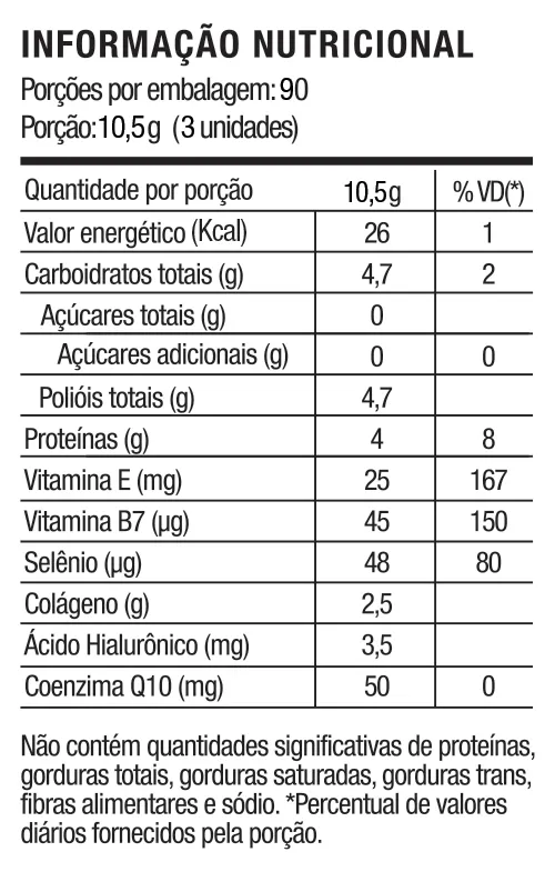 Nicotinamida, acetato de DL-alfa-tocoferol, bisglicinato de zinco, D-pantotenato de cálcio, cloridrato de tiamina, riboflavina, cloridrato de piridoxina, óleo de palma (Elaeis guineenses), acetato de retinol, ácido fólico, selenito de sódio, vitamina D3 (Colecalciferol), D-biotina, cianocobalamina, edulcorantes xarope de maltitol, sorbitol e glicosídeos de esteviol de Stevia rebaudiana Bertoni, gelificantes gelatina e pectinas, acidulante ácido cítrico, aromatizante natural de laranja, corante beta-caroteno sintético, conservante sorbato de potássio, glaceante cera de carnaúba.